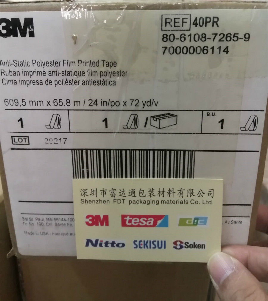 #40胶带有全透明和标记印刷两种。一面印刷的胶带面印上了3M的标志和ESD标记。这些标记用来帮助工作人员鉴别和区分#40胶带。